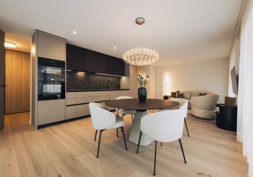 Die offene Küche fügt sich nahtlos in den Raum ein, während der runde Esstisch und die komfortablen Stoffstühle das Zentrum des Apartments bilden. Ein zeitloses Interiorkonzept, das Stil und Wohnqualität perfekt verbindet und einen Mehrwert schafft.